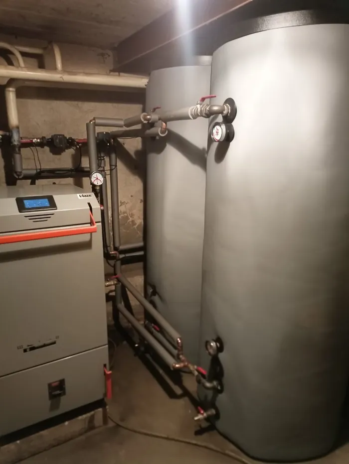 Dům s vytápěnou plochou 140 m² v jednom nadzemním podlaží a tepelnou ztrátou 13 kW byl vybaven účinným systémem zahrnujícím dvě akumulační nádoby o objemu 750 litrů, zásobník TUV o objemu 160 litrů a dva okruhy – topný se směšováním a okruh pro ohřev teplé užitkové vody. Původní komín s keramickou vložkou byl zachován a odpovídá novému systému.