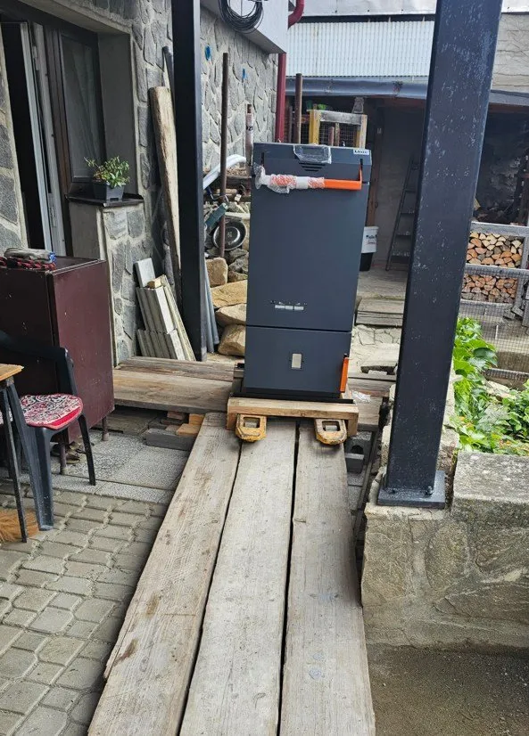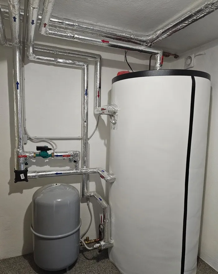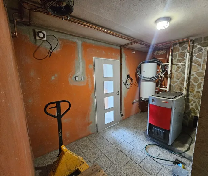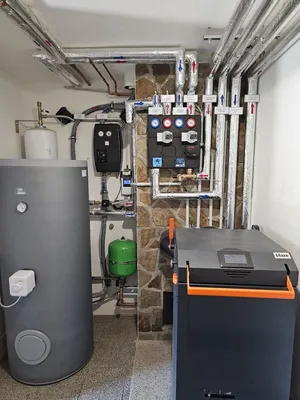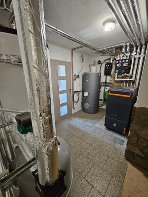Tato instalace kotle slouží jako referenční kotelna, kterou mohou zájemci o naše produkty osobně navštívit, aby si prohlédli, jak kotel v reálném prostředí vypadá a funguje. Návštěvníci mají možnost vidět nejen samotný kotel v provozu, ale také celkové řešení vytápění, včetně připojených komponent, jako jsou akumulační nádoby a další vybavení. Kotelna je důkazem toho, že i technické prostory mohou být čisté a esteticky upravené. Celá instalace byla provedena s důrazem na detail a funkčnost, přičemž kotelna působí moderně a udržovaně. Tento prostor je nejen plně funkční, ale také příjemný na pohled, což dokazuje, že kvalitní technika může být součástí hezky zpracovaného interiéru.