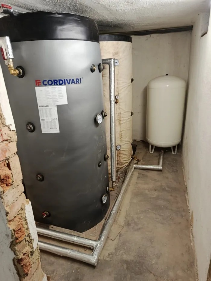 Topný systém je rozdělen na dva samostatné okruhy – pro 1. a 2. nadzemní podlaží. Pro akumulaci tepla byly využity dvě nádrže – nová akumulační nádrž o objemu 1 000 litrů a stávající akumulační nádrž o objemu 1 000 litrů, čímž vznikla dostatečná zásoba energie pro komfortní vytápění i ohřev vody.